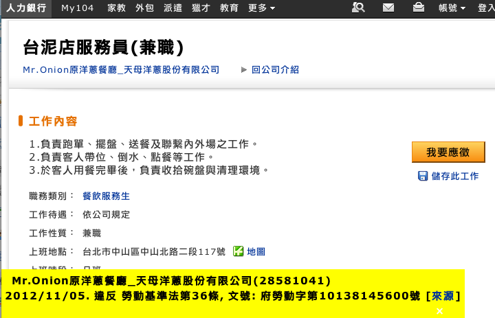 收集各縣市違反勞基法公司名錄,並且做成 Chrome Extension ,讓使用者安裝之後,只要在瀏覽 104, 1111, 518, yes123 等人力銀行時,只要該公司在違法名單中就會跳出警告