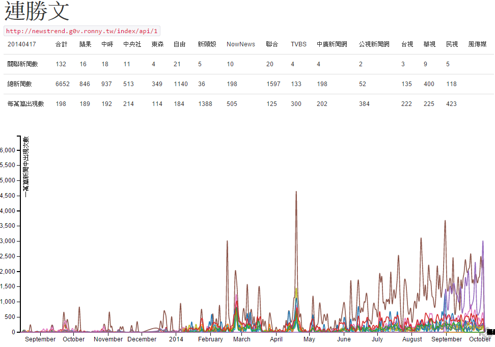 利用 NewsDiff 資料做的服務,可以輸入關鍵字,搜尋該關鍵字在各媒體出現的歷史記錄,以方便分析各媒體的新聞偏好以及事件的關注度