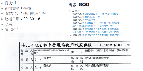 收集台北市從民國 38 年到 102 年的建築使用執照掃描本,目前資料沒有再更新,正在處理其他來源希望可能直接針對全台灣資料做處理