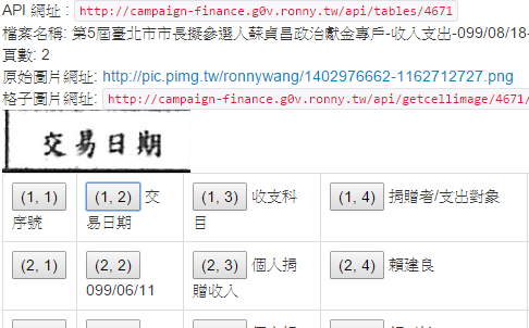 利用影像處理將政治獻金的掃描圖檔抓出框線並切出每一個格子,並接力將每一格丟給 @ctiml 做的 http://campaign-finance.g0v.ctiml.tw/ 利用群眾外包來將掃描文件 OCR 出來